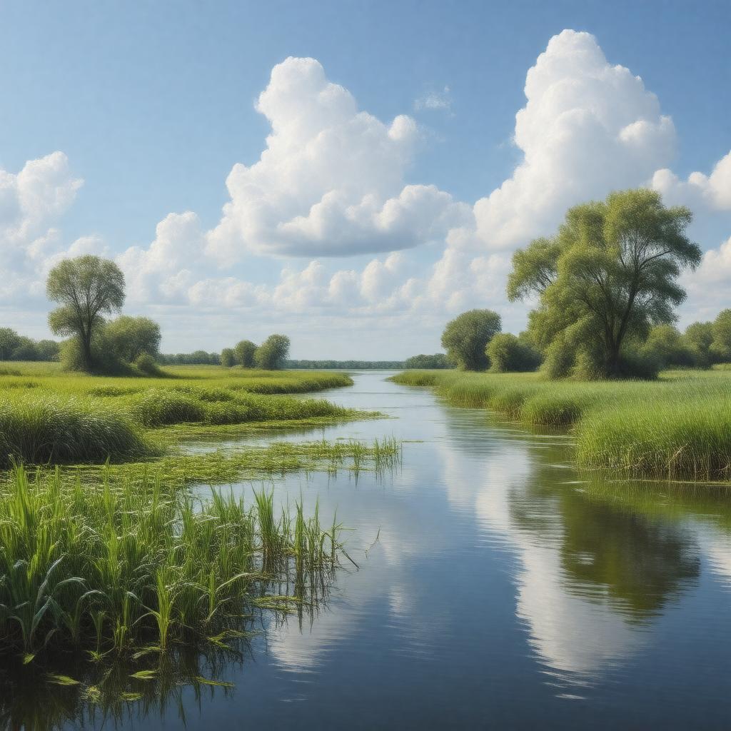"Generate a serene and vibrant image of the Danube Delta, a UNESCO World Heritage Site located in Romania and Ukraine, showcasing its unique ecosystem with lush reed beds, lakes, and marshes, teeming with over 300 bird species and 45 freshwater fish species, with the Danube River flowing into the Black Sea in the background, under a clear blue sky with a few puffy white clouds, in a realistic and detailed style."