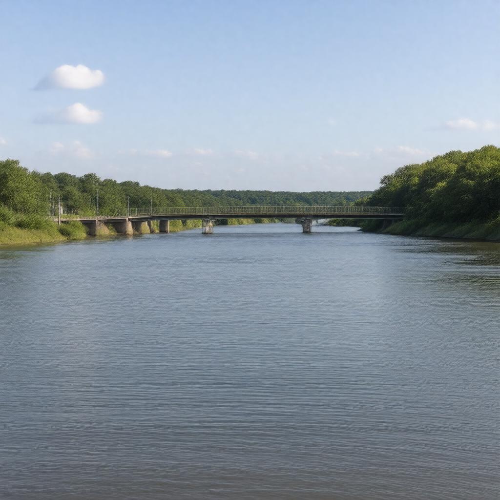 "Generate a serene landscape image of the Danvers River, a 5-mile-long river in Massachusetts, United States, flowing through the towns of Danvers, Beverly, and Salem, with the Beverly-Salem Bridge, Veterans Memorial Bridge, and Kernwood Bridge spanning over it, surrounded by lush greenery and calm waters, ultimately emptying into Salem Harbor."