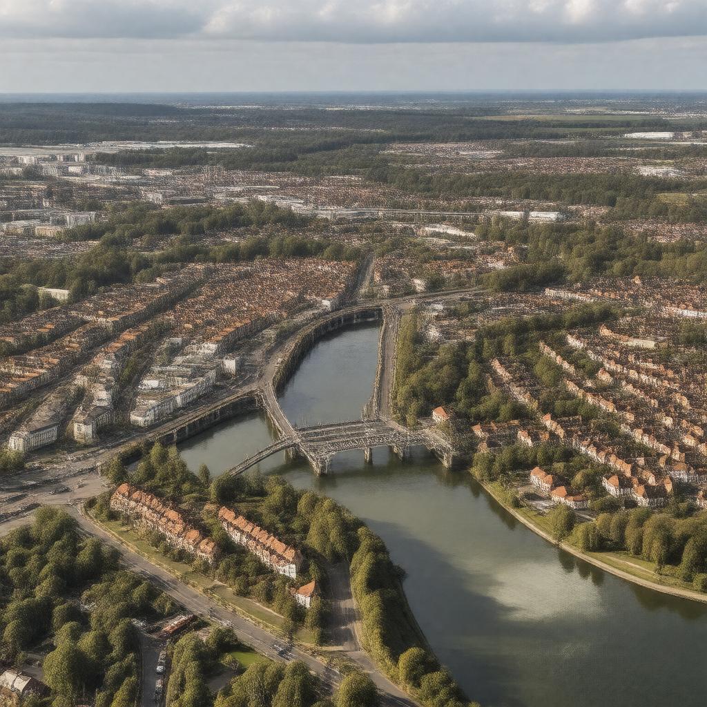 "Generate an image of a town in South East England, with a population of approximately 110,000, located in Kent, featuring the Dartford Crossing, Bluewater Shopping Centre, and situated near the River Darent, with a mix of modern and historical architecture, in a realistic style."