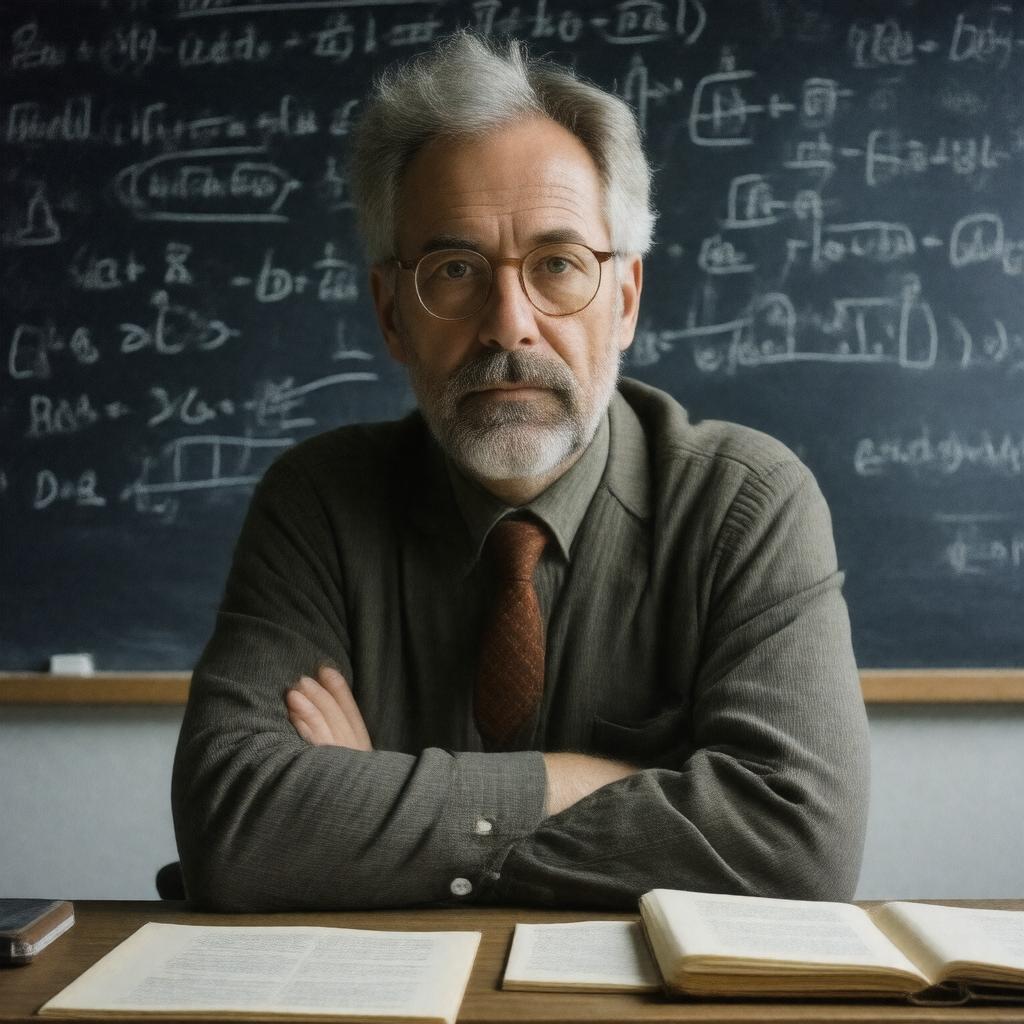"Generate a realistic image of a middle-aged male physicist in a formal setting, sitting in a university office or standing in front of a blackboard with complex equations, wearing glasses and a thoughtful expression, representing David Deutsch, a British physicist and author, with a background that subtly suggests his connection to quantum physics and computation."