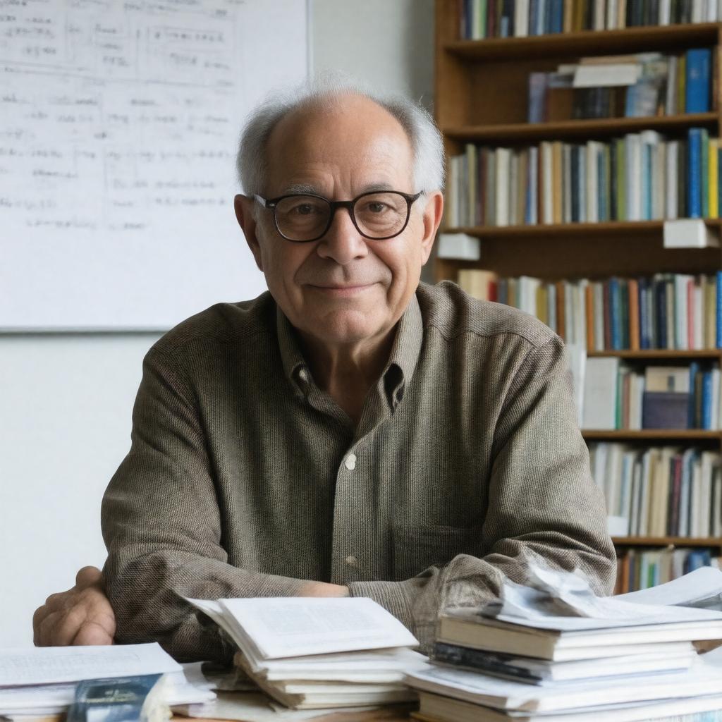 Create an image of David Kahneman, a renowned Israeli-American psychologist and economist, sitting in a quiet, contemplative environment, surrounded by books and papers, with a thoughtful expression. He is an older man with a gentle face, wearing a pair of glasses and a warm smile. Incorporate subtle hints of his notable works, such as a copy of "Thinking, Fast and Slow" or a whiteboard with equations and diagrams related to prospect theory and heuristics and biases. The style should be realistic, with a warm and inviting color palette, conveying a sense of intellectual curiosity and introspection.