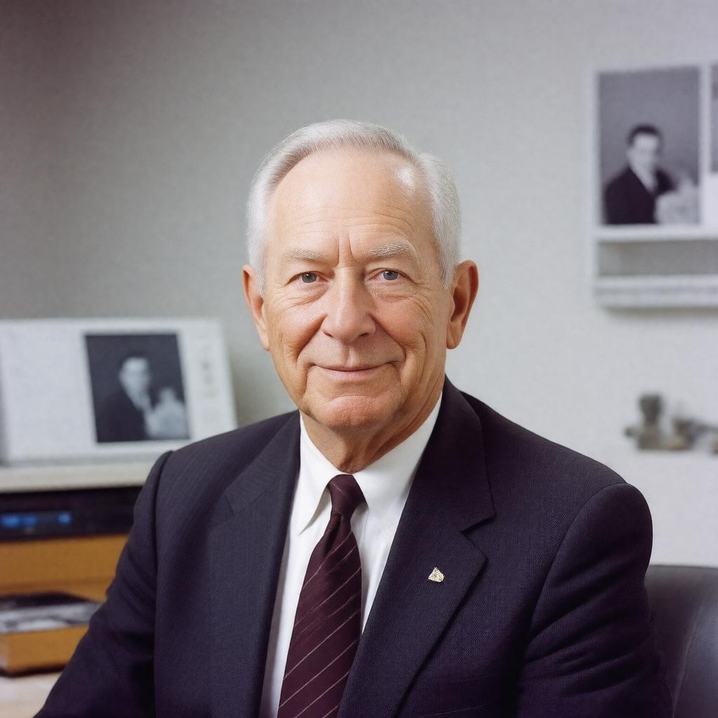 Generate a realistic image of David Packard, a middle-aged man with a gentle smile, wearing a suit and tie, sitting in a professional setting, possibly with a background that reflects his connection to technology or business, such as a laboratory or office with electronics equipment. Incorporate subtle hints of his philanthropic efforts, such as a book or a photo of his family in the background. The style should be formal and professional, reflecting his achievements as a renowned engineer, businessman, and philanthropist.