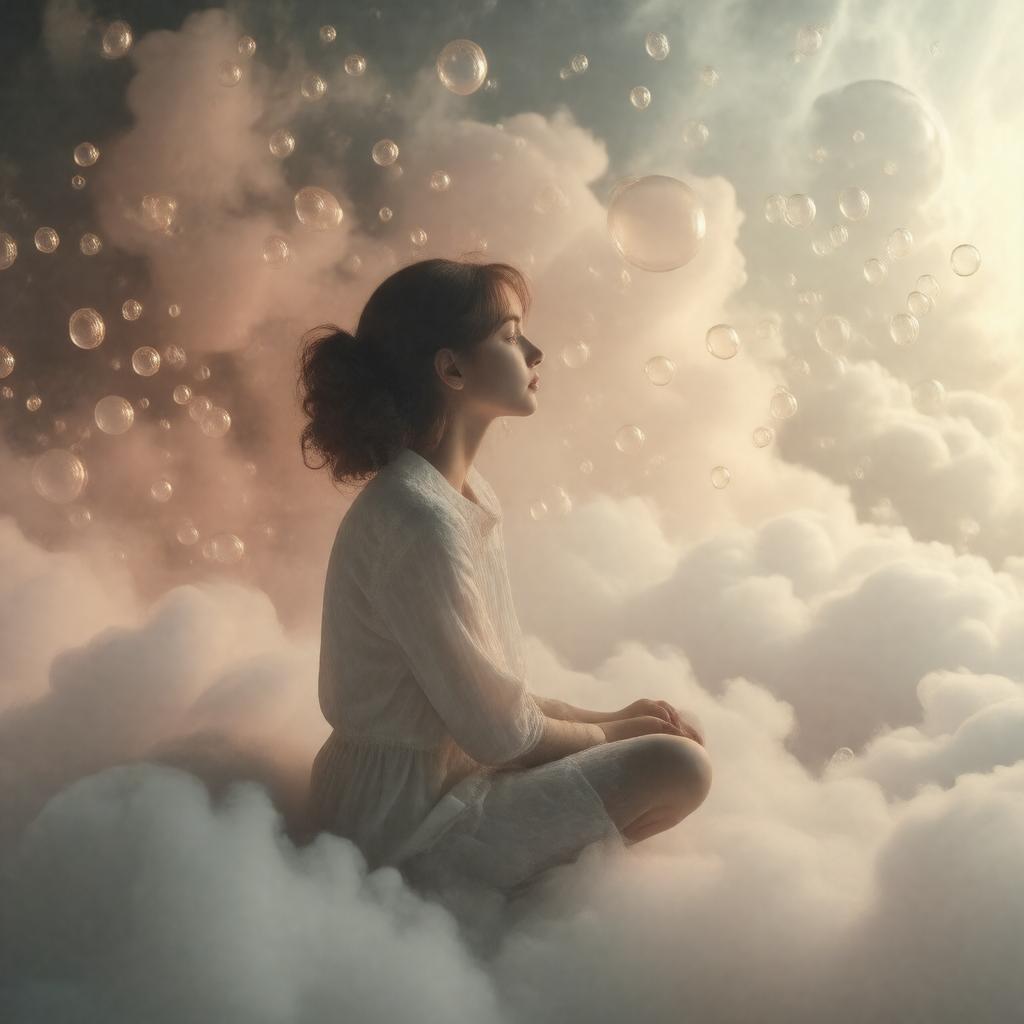 "Generate an image of a serene, dreamy scene representing the concept of Day Dreaming. The scene should feature a young woman sitting on a cloud, surrounded by floating thoughts and imagination bubbles, with a distant, soft focus expression. Incorporate warm, pastel colors to evoke a sense of calmness and nostalgia. Style: whimsical, ethereal, and soft. The image should convey a sense of getting lost in one's thoughts and imagination."