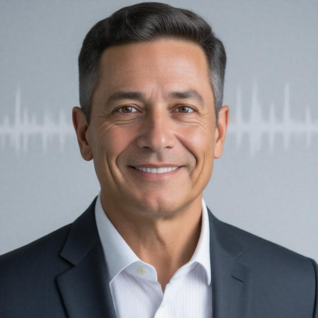 "Create a realistic portrait of Deb Roy, a middle-aged Canadian man with a warm smile, wearing a suit and standing in front of a subtle background that hints at his connection to technology and media, possibly with a faint image of a speech waveform or a robotic interface; he should exude a sense of intelligence and innovation, reflecting his work as a professor, researcher, and entrepreneur in the fields of media, artificial intelligence, and cognitive science."