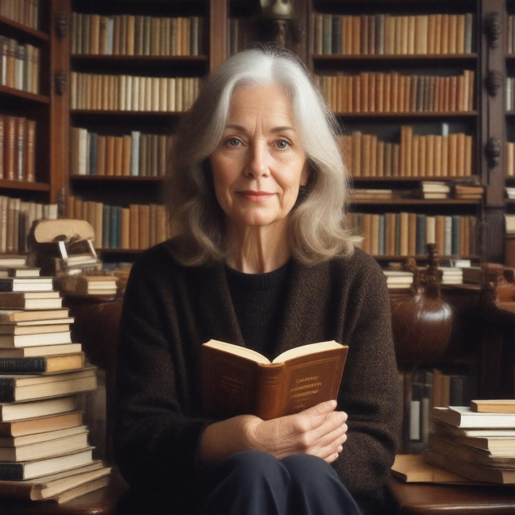Create a realistic portrait of Deborah Fallows, an American linguist and writer, sitting in a cozy library or study surrounded by books, with a warm and introspective expression, wearing attire consistent with her profession, and perhaps holding one of her notable books, such as "Our Towns: A 100,000-Mile Journey into the Heart of America" or "Dreaming in Chinese: Mandarin Lessons In Life, Love, And Language".