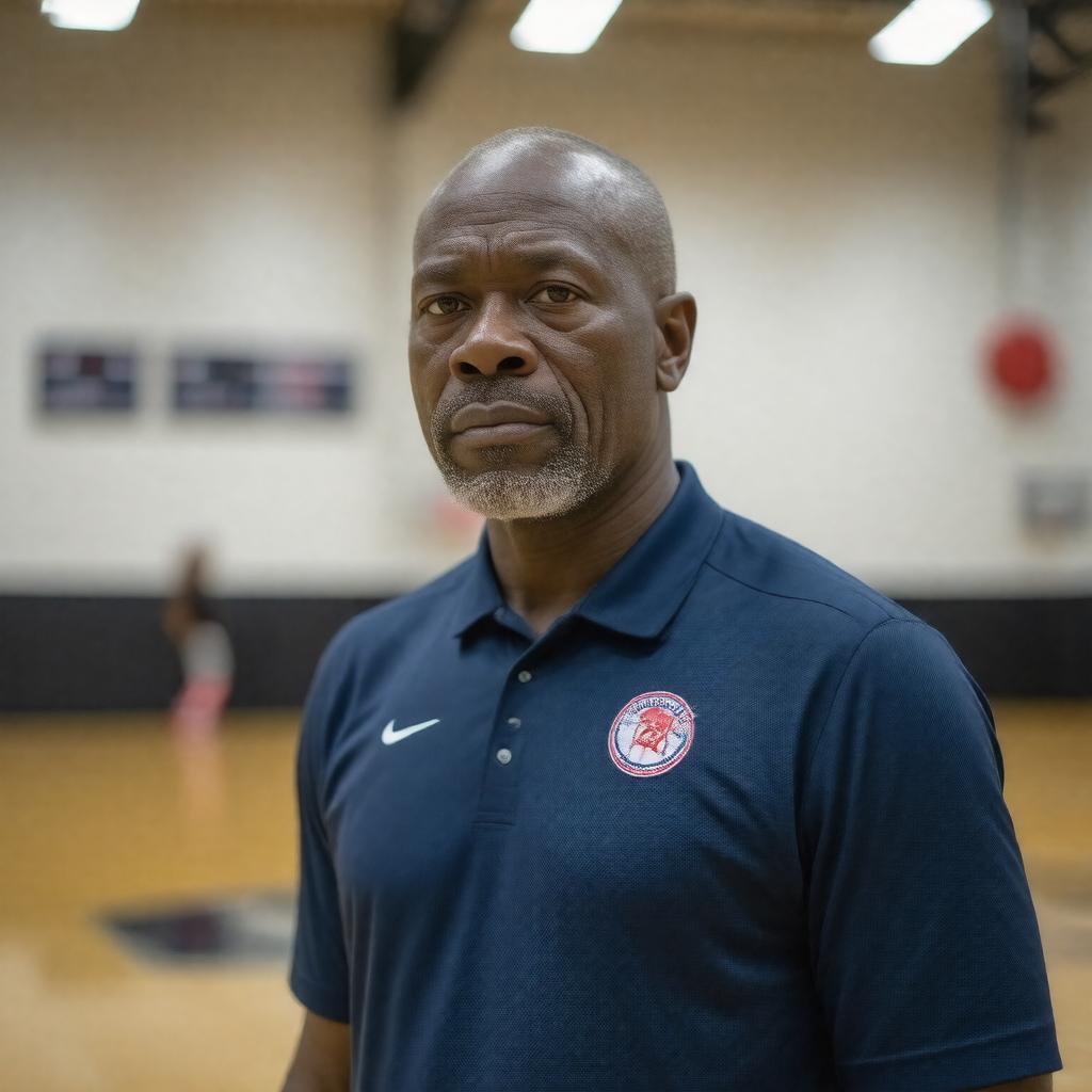 Generate a realistic portrait of Dennis Gates, an African-American basketball coach, in a coaching attire, possibly with a whistle around his neck, standing in front of a blurred basketball court background, with a serious and focused expression, in a style that resembles a sports photography shot.