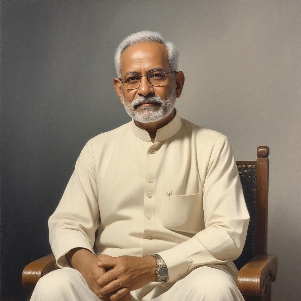 Generate a realistic portrait of Chaudhary Devi Lal, an Indian politician and champion of farmers' rights, in a formal attire, possibly with a background that reflects his association with the Indian National Lok Dal, Janata Dal, or Indian National Congress, and with a gentle yet firm expression that embodies his nickname "Tau", sitting in a dignified pose with a subtle hint of a rural or agricultural setting to signify his connection to the farming community.