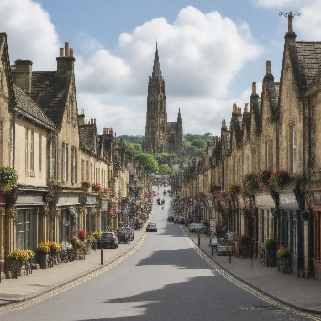 "Generate an image of a charming town in West Yorkshire, England, with a bustling high street, surrounded by historic buildings, and featuring Dewsbury Minster in the background, under a sunny day with a few clouds, in a realistic and picturesque style."