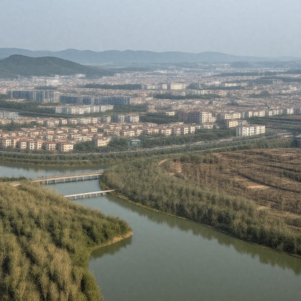 "Generate a realistic image of Deyang city in southwest China, showcasing its urban landscape with a mix of modern and industrial architecture, situated near the Tuo River, with a subtle background hint of the Sanxingdui archaeological site and heavy machinery industry, under a clear China Standard Time sky."