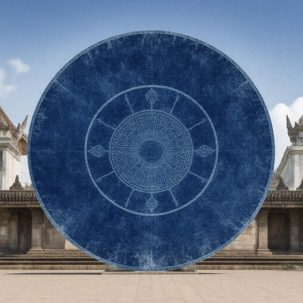 Generate an image of a navy blue Dharmachakra with eight spokes, symbolizing the Noble Eightfold Path, set against a serene Buddhist temple background, reminiscent of the Ashoka Chakra and Sarnath, representing the Wheel of Law and Buddha's teaching.