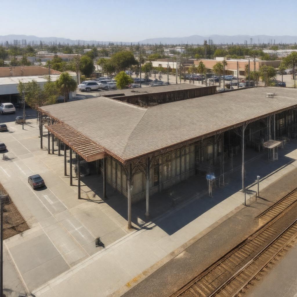 "Generate a realistic image of Diridon Station, a railway station located at 65 Cahill Street, San Jose, CA 95110, with a mix of modern and historic architectural elements, featuring a large structure with multiple platforms and tracks, surrounded by parking and bicycle facilities, under a sunny California sky."