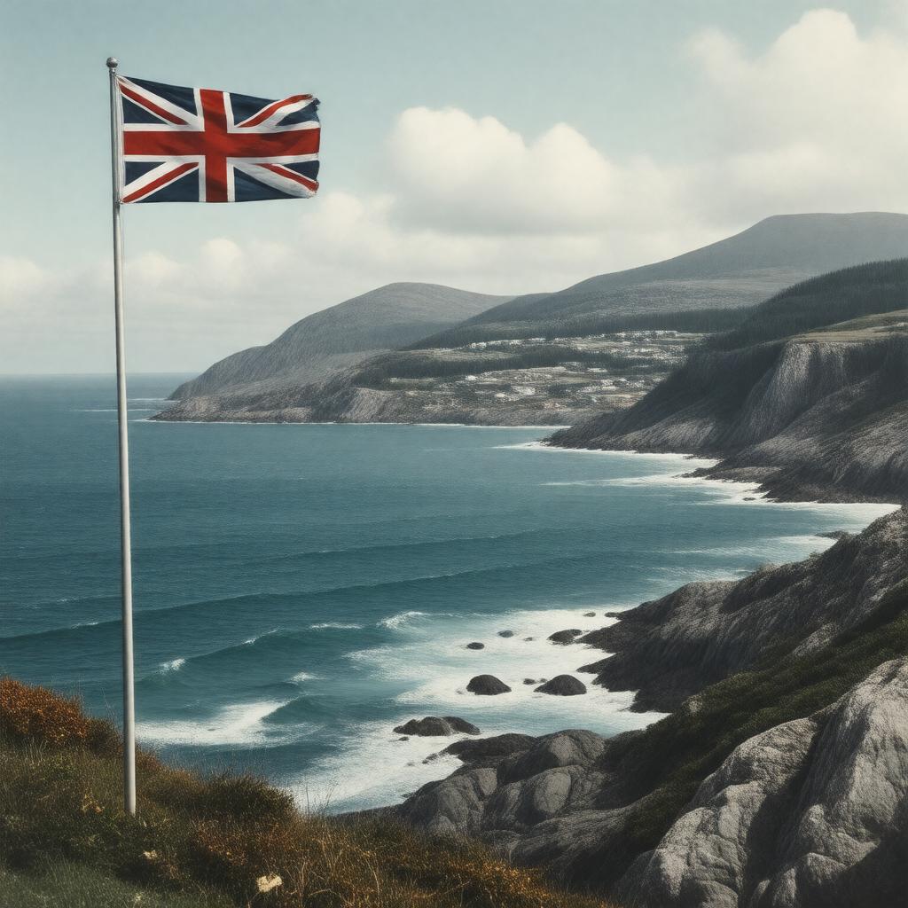 "Generate an image of a scenic coastal landscape of the Dominion of Newfoundland, featuring the Atlantic Ocean, rugged coastline, and a small settlement in the distance, with a subtle Union Jack flag waving in the foreground, symbolizing its status as a British dominion from 1907 to 1949, with a realistic and vintage-inspired style."