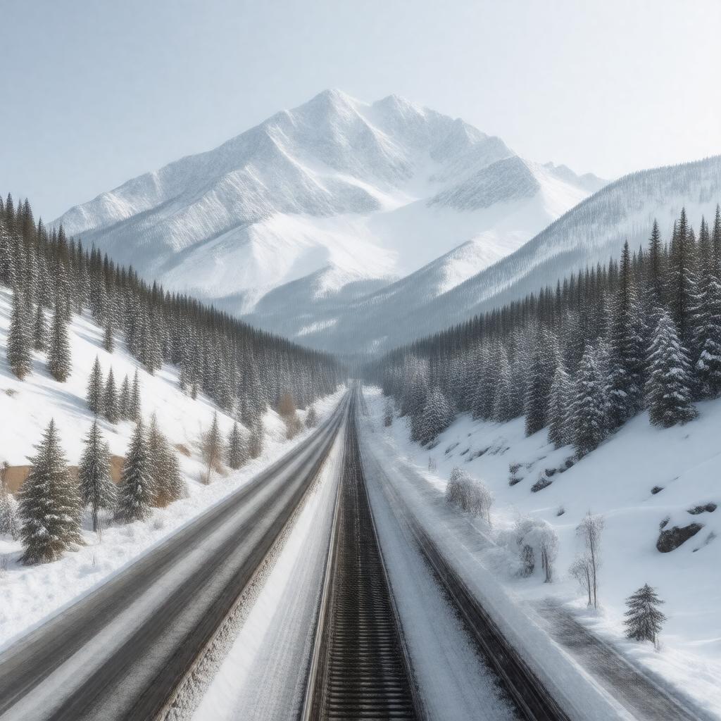 "Generate an image of a mountain pass in the Sierra Nevada mountain range in California, with a high elevation and heavy snowfall, featuring Interstate 80 and Union Pacific Railroad crossing through, surrounded by alpine climate and scenic trails, including the Pacific Crest Trail, with landmarks such as Donner Summit Bridge and Donner Memorial State Park, and nearby attractions like Sugar Bowl Resort and Donner Lake, in a realistic style."