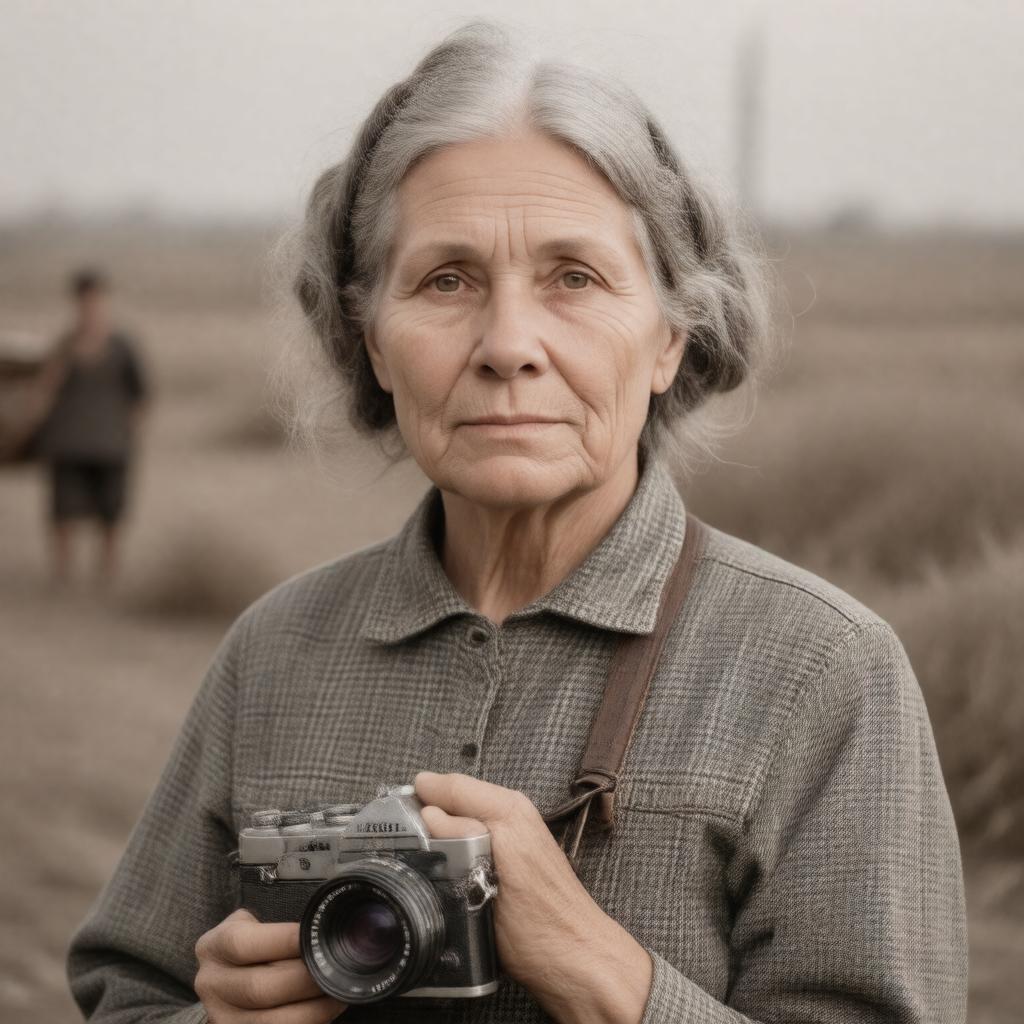 Create a realistic image of Dorothea Lange, a middle-aged American woman of German descent, with a gentle yet determined expression, wearing attire typical of the early 20th century, possibly with a camera around her neck or in her hands, reflecting her profession as a documentary photographer, in a style reminiscent of classic photography.