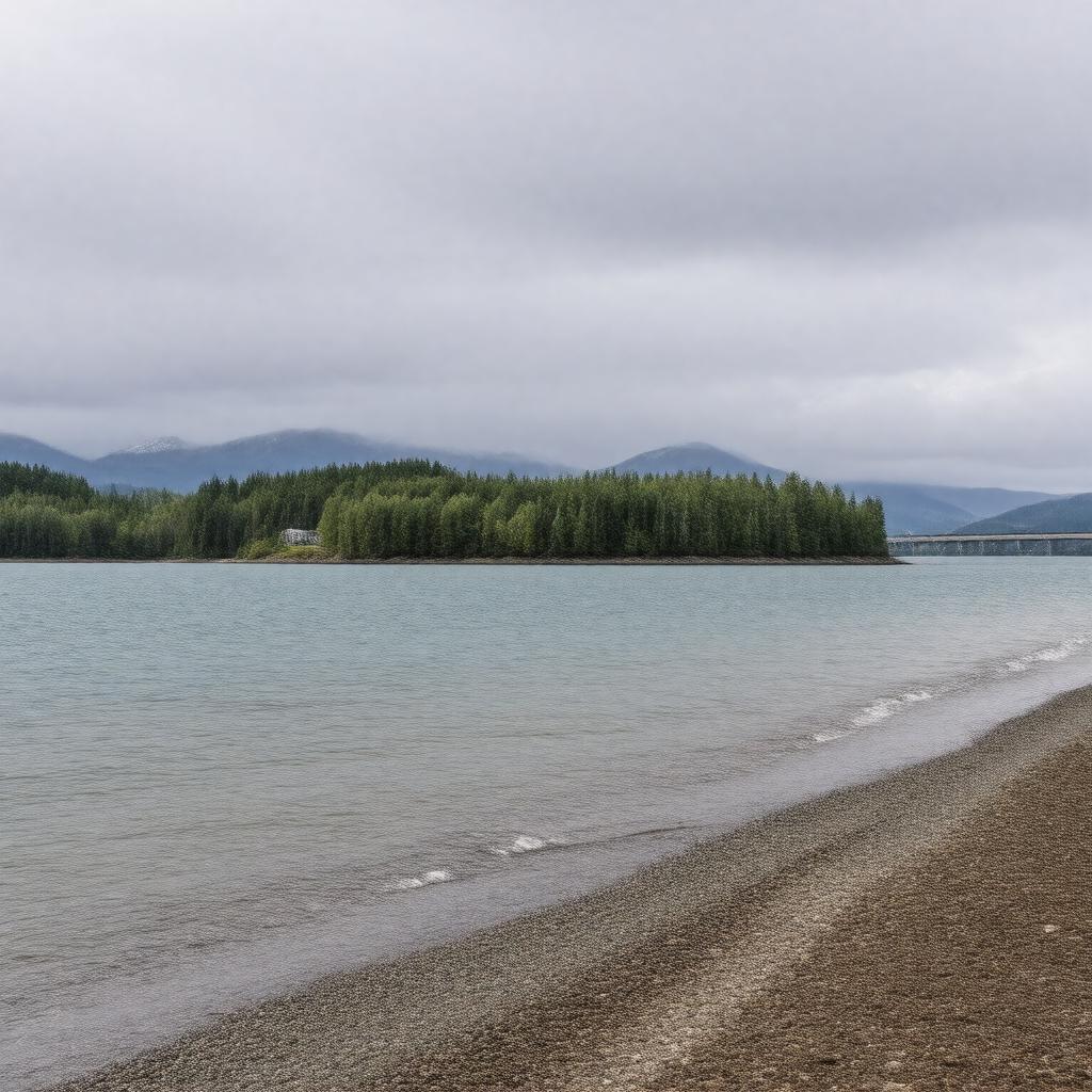 "Generate a realistic landscape image of Douglas Island, an island located in the Gastineau Channel, Alaska, with a view of the surrounding waters and the Juneau-Douglas Bridge in the distance, featuring Mount Jumbo in the background and a glimpse of Sandy Beach or Treadwell Mine Historic Trail in the foreground, under a scenic Alaska Time Zone sky."