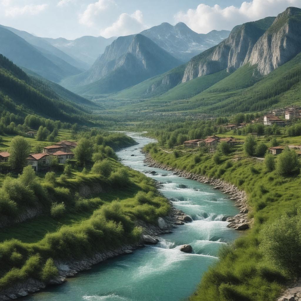 "Generate a serene landscape image of the Drin River, a 285 km long river located in the Balkans, flowing through Albania, Montenegro, and Kosovo, with a basin size of 19,582 km², and emptying into the Adriatic Sea. Depict the river meandering through a scenic valley with lush greenery and surrounding mountains, and include a hydroelectric dam, such as the Fierza Dam, Koman Dam, or Vau i Dejës Dam, in the background. Incorporate a few traditional Albanian or Montenegrin villages or towns, like Shkodër, Lezhë, or Kukës, along the riverbanks. The style should be a mix of realism and impressionism, conveying a sense of tranquility and natural beauty."