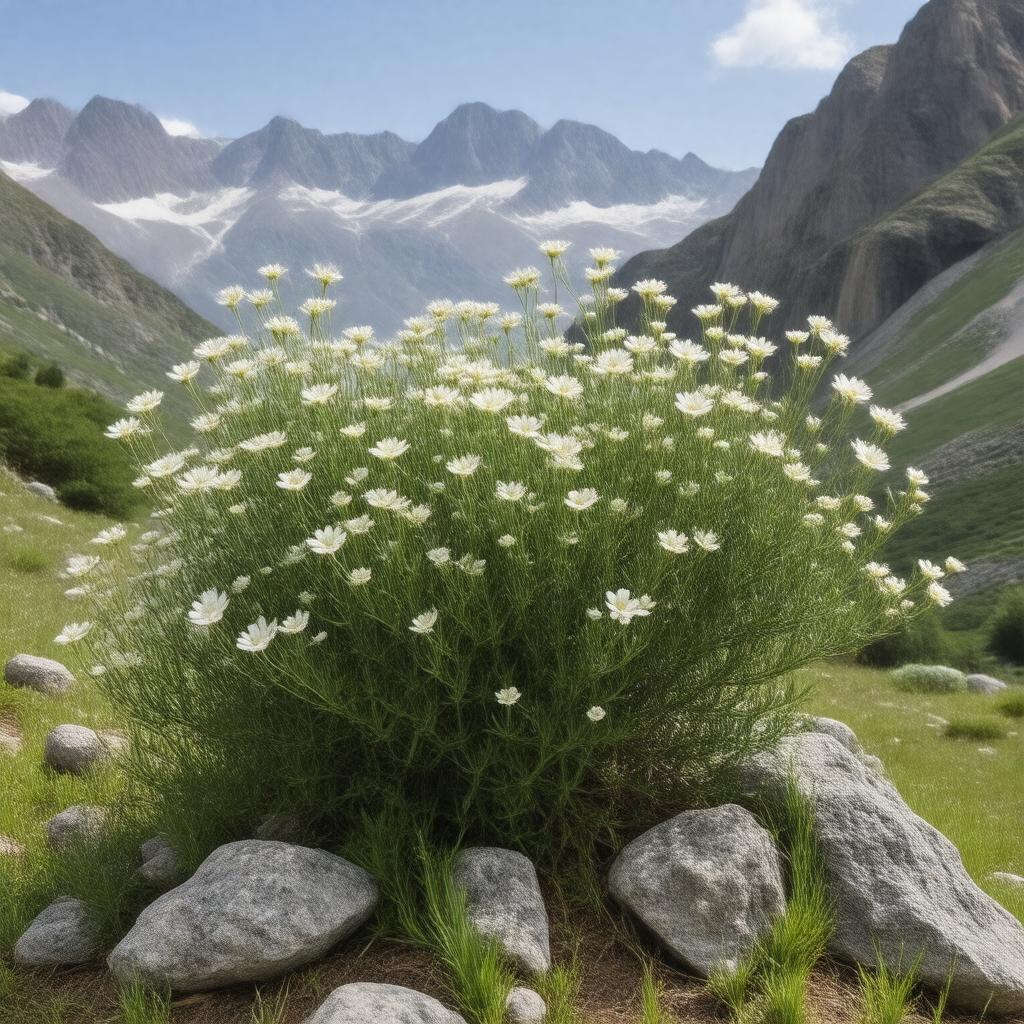 "Generate an image of a serene, mountainous landscape in the Northern Hemisphere, featuring a cluster of flowering Dryas octopetala plants, also known as white dryad, with small, white, actinomorphic flowers and achene fruits, set against a backdrop of rugged terrain and rocky outcrops, under a clear blue sky, in a realistic and detailed style."