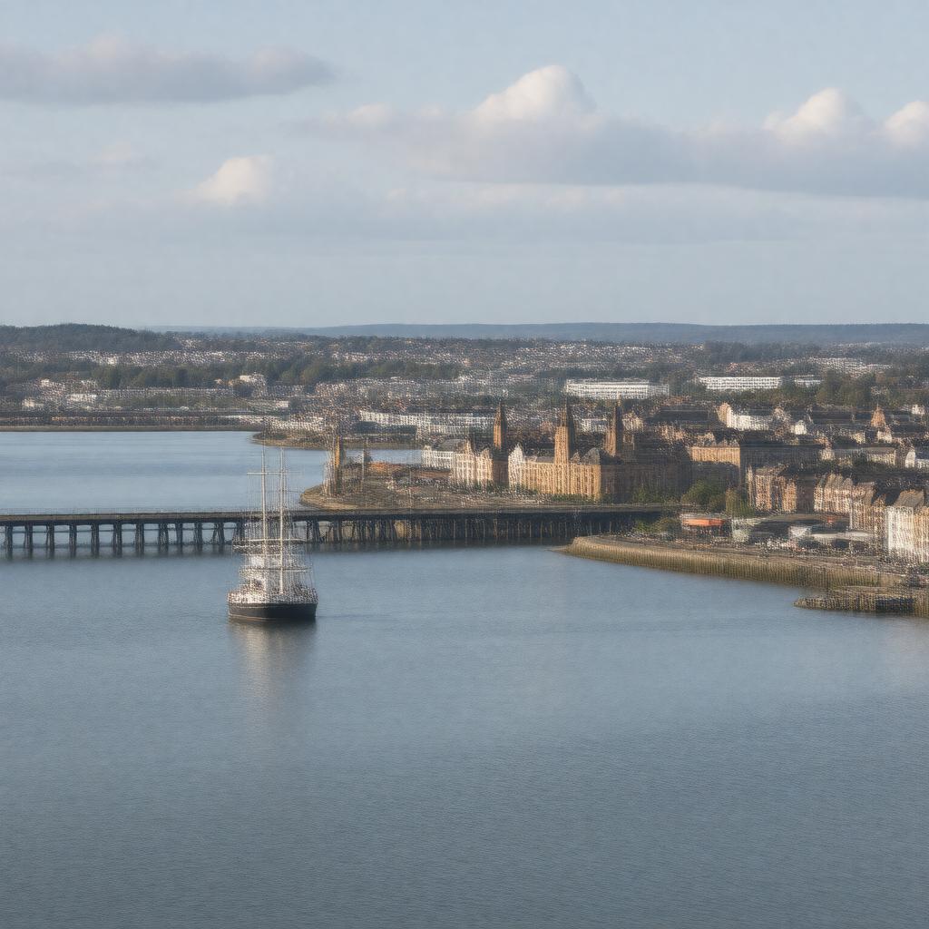 "Generate an image of Dundee, a city located on the north bank of the Firth of Tay in Scotland, with a scenic view of the Tay Road Bridge and the cityscape, incorporating elements that reflect its nickname 'City of Discovery', such as a subtle image of the RRS Discovery or a nod to its famous industries, in a realistic style."