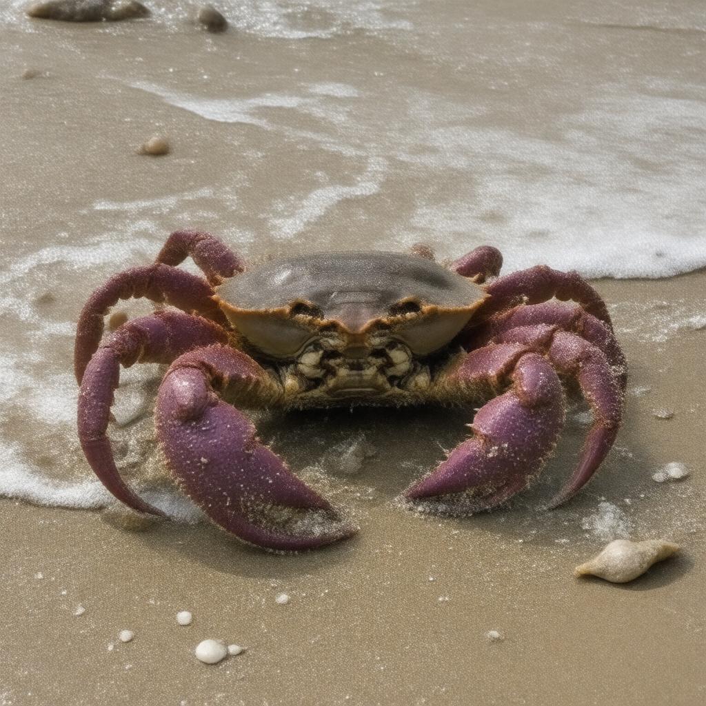 "Generate an image of a Dungeness crab, Metacarcinus magister, in its natural habitat on a sandy and muddy bottom in the Pacific Ocean, off the West coast of North America, with a width of approximately 23 cm, and a brown to purple shell color, surrounded by possible predators such as sea otters, octopuses, or fish, in a realistic style."