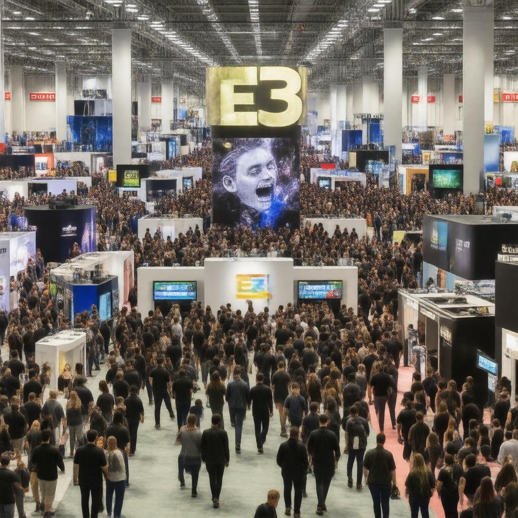 "Generate an image of a large, crowded convention center with various video game booths and exhibits, prominently featuring logos and branding from major gaming companies such as Sony, Microsoft, and Nintendo, with attendees and industry professionals walking around and engaging with the displays, set against the backdrop of the Los Angeles Convention Center in Los Angeles, California, with a stylized E3 logo visible in the foreground."