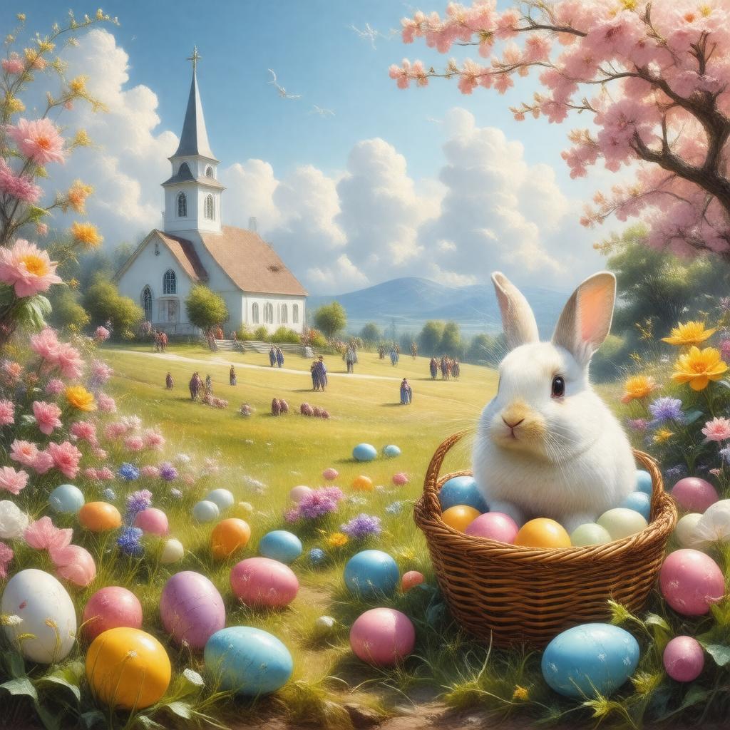 "Generate an image of a vibrant and joyful Easter Sunday scene, depicting a sunny day with a white church steeple in the background, surrounded by colorful Easter eggs, blooming flowers, and a Easter bunny with a basket of eggs, symbolizing the celebration of Jesus' resurrection, on a serene landscape with a few people in the distance attending church services or family gatherings, in a realistic and warm style."