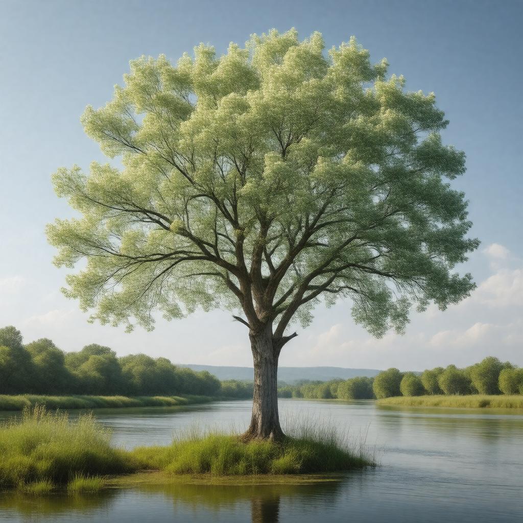 "Generate an image of a majestic Eastern cottonwood tree (Populus deltoides) standing tall on a riverbank, its gray bark glistening in the sunlight, with deltoid leaves rustling in the gentle breeze, and a few catkins visible, set against a backdrop of a serene floodplain landscape, in a realistic and detailed style."