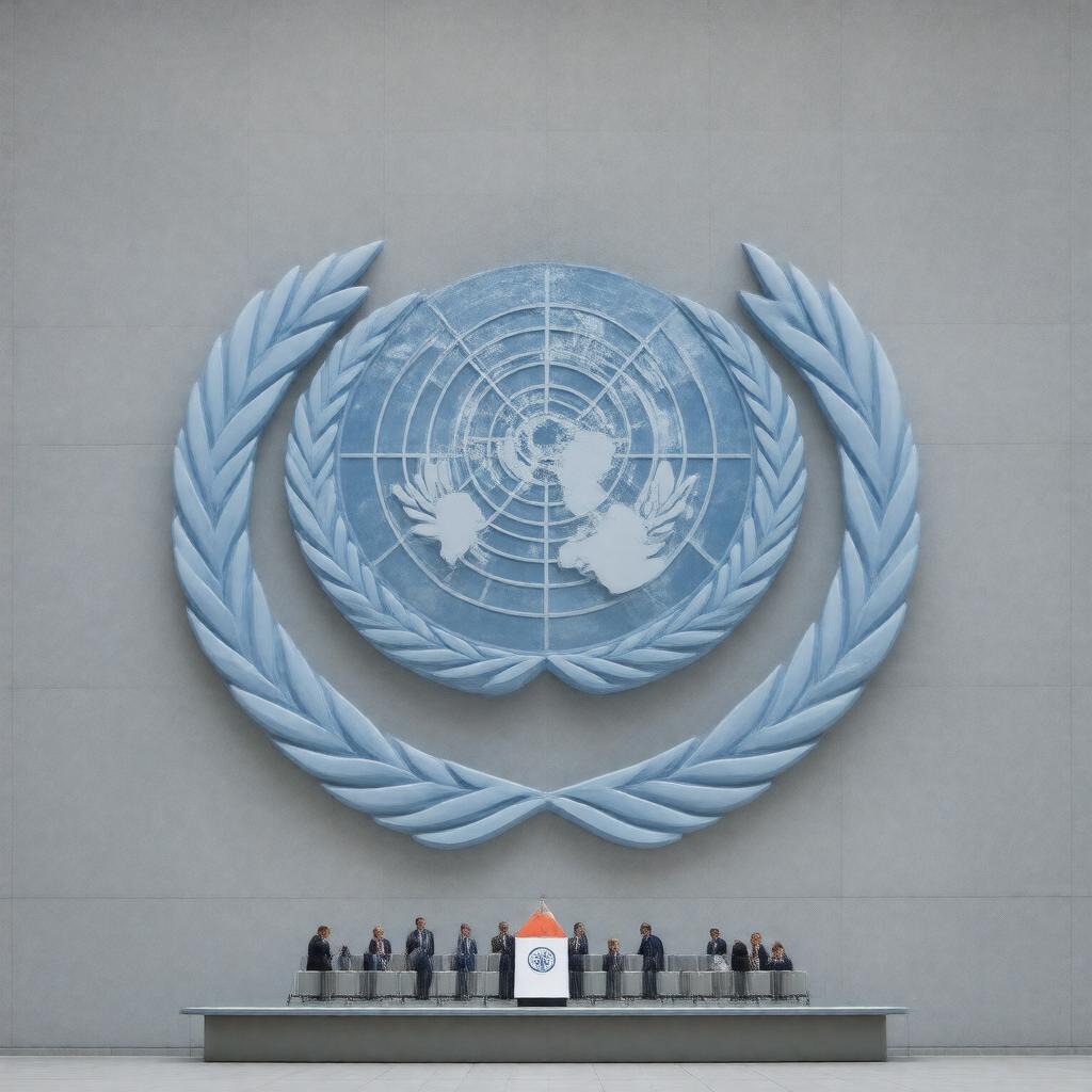 "Create an image of the Economic and Social Council (ECOSOC) of the United Nations, a deliberative body promoting international economic and social cooperation and development. The image should feature a formal, modern architectural background representing the United Nations headquarters in New York City. In the foreground, display the ECOSOC logo or a symbolic representation of its functions, such as a globe surrounded by interconnected gears or a stylized graph showing growth and development. The color scheme should reflect a sense of professionalism, unity, and progress, incorporating blues and whites. The style should be sleek, contemporary, and suitable for an official United Nations organ, conveying a sense of cooperation, development, and global partnership."