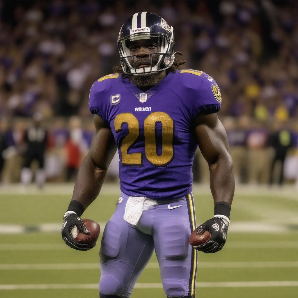 Create an image of Ed Reed, a renowned American football safety, in his Baltimore Ravens uniform, specifically wearing his iconic number 20 jersey, standing confidently on the field with a football in hand, showcasing his impressive athletic stance, with a subtle background hinting at his Pro Football Hall of Fame and numerous accolades, in a realistic and dynamic sports photography style.