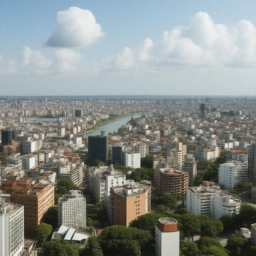 "Generate a realistic image of Edogawa, a special ward in Tokyo, Japan, showcasing its vibrant cityscape with a mix of residential and commercial buildings, and a glimpse of the Edo River or Arakawa River in the background, possibly with fireworks or festivities hinting at the Edogawa Fireworks Festival, under a bright and sunny day with a few clouds, in a daytime setting."