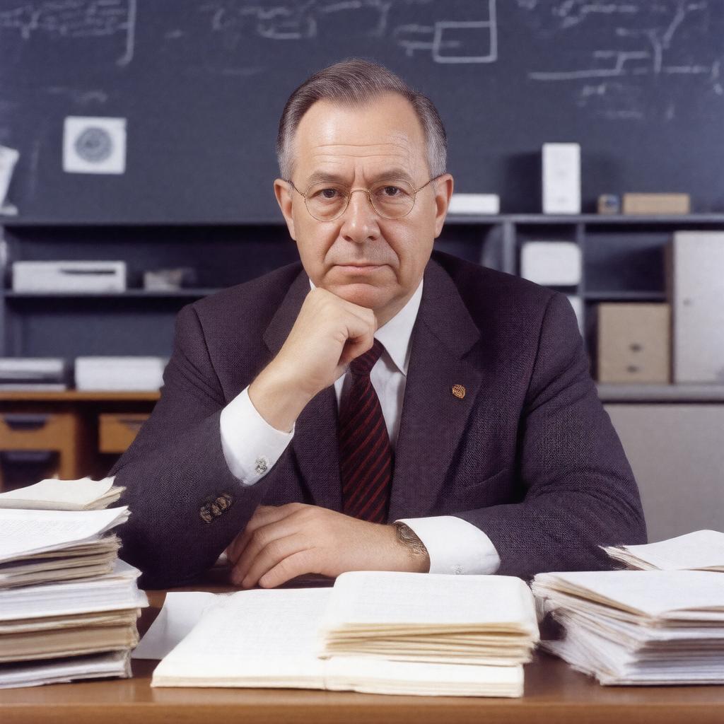 "Portrait of Edsger Wybe Dijkstra, a middle-aged Dutch computer scientist with a thoughtful expression, sitting in a study with books and papers around him, wearing a suit and tie, with a subtle background hint of computer equipment or programming symbols, in a realistic and formal style."