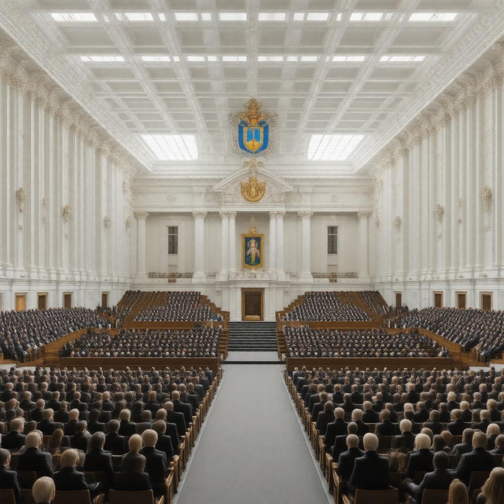 "Generate an image of the Parliament House in Helsinki, Finland, with a focus on its grand architecture and imposing facade, symbolizing the Eduskunta, the unicameral parliament of Finland, during a session with members gathered in the plenary hall, incorporating elements of the Finnish coat of arms and the country's flag, in a realistic and formal style."