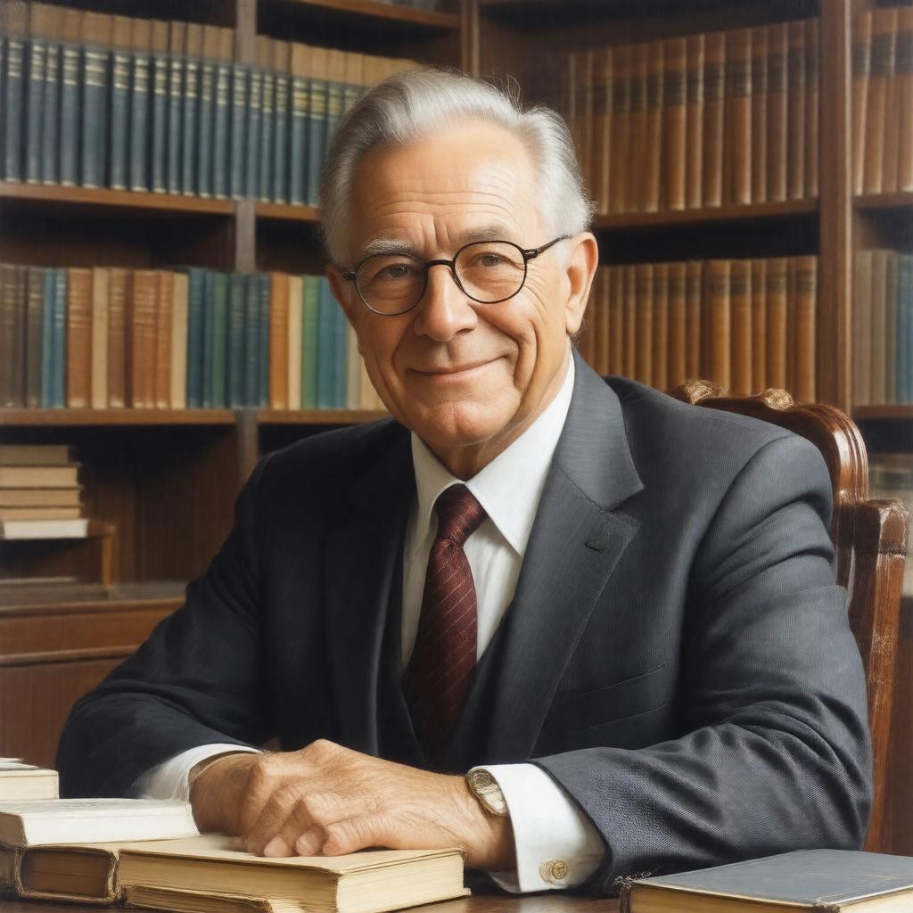 Create a realistic image of Edward S. Herman, a middle-aged man in his 70s or 80s, with a gentle and intellectual expression, wearing glasses and a suit, sitting in a library or office surrounded by books, with a subtle hint of a smile, in a style that conveys a sense of authority and thoughtfulness.
