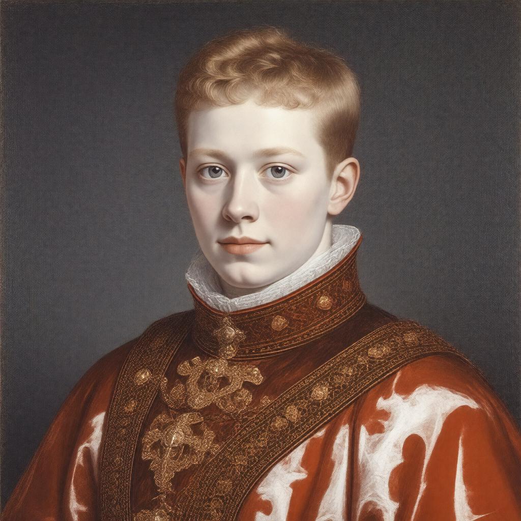 "Generate a realistic portrait of Edward VI of England, King of England and High King of Ireland, in a formal attire befitting his royal status, with a backdrop that subtly suggests the Protestant Reformation in England, such as a hint of a church or a prayer book. Incorporate elements that reflect his youth and fragile health, but also convey his royal authority and significance in English history."