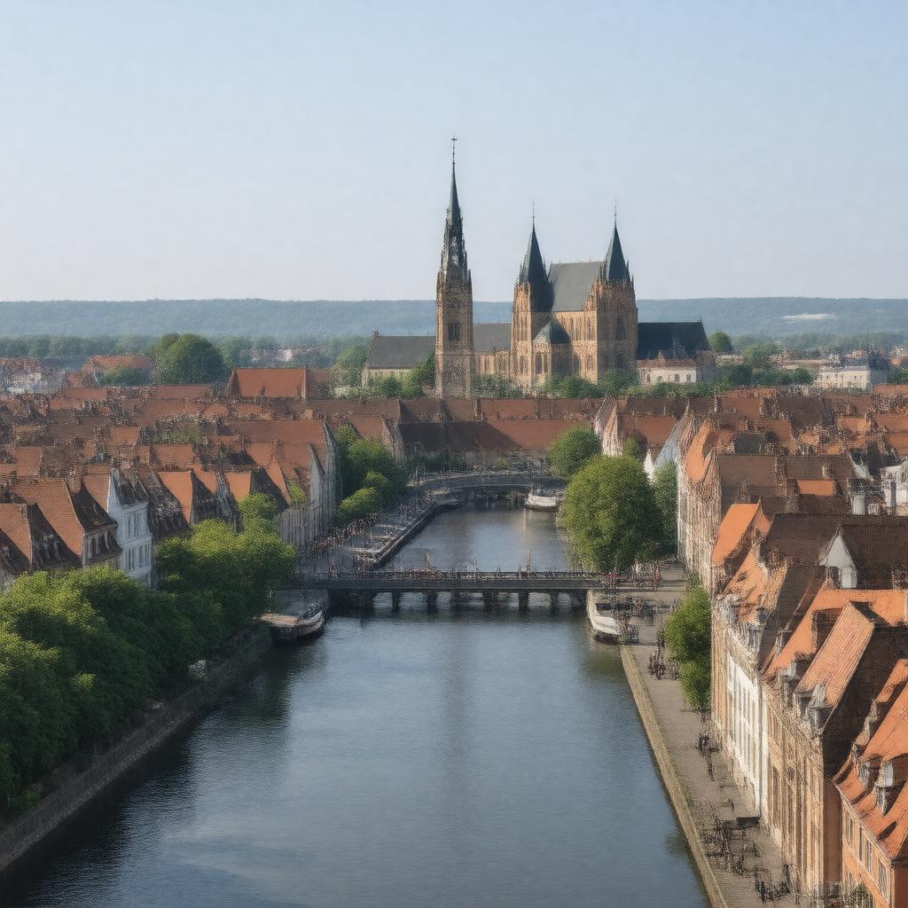 "Generate a realistic image of Elbląg cityscape, showcasing its Old Town, Market Gate, and St. Nicholas Cathedral, with the Elbląg River and Elbląg Canal in the background, under a clear sky with a subtle hint of the city's rich history and Hanseatic League heritage."