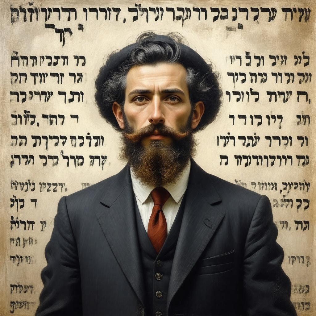 Generate an image of a traditional Jewish man, possibly with a beard and wearing a suit, standing in front of a Hebrew-inscribed background, symbolizing the meaning "God is my help", in a realistic and respectful style, representing Eliezer, a given name of Hebrew origin.
