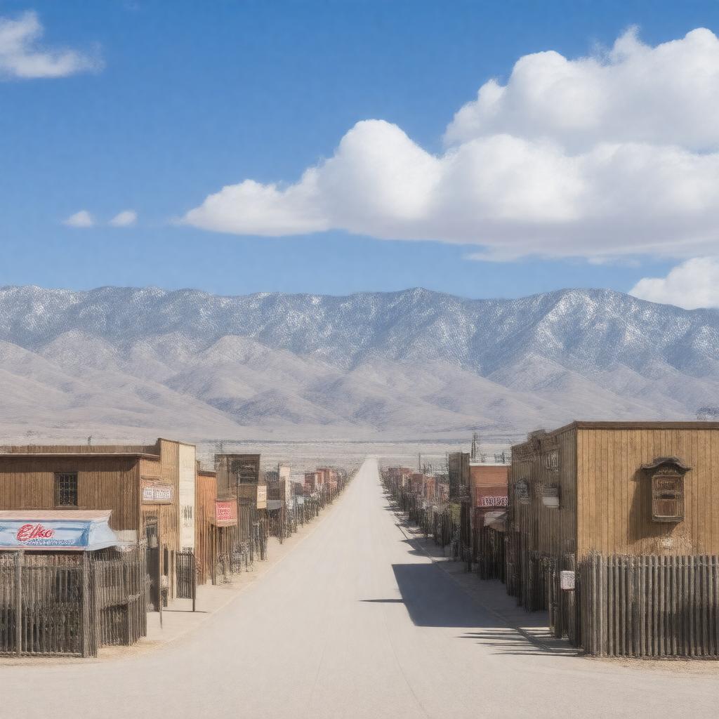 "Generate a realistic image of Elko, a city located in the heart of Northeast Nevada, with a semi-arid climate, situated on the banks of the Humboldt River, featuring the city's downtown area with a backdrop of mountains, incorporating elements that reflect its rich cowboy culture, such as a rodeo or cowboy-themed architecture, under a clear blue sky with a few puffy clouds, in a photorealistic style."