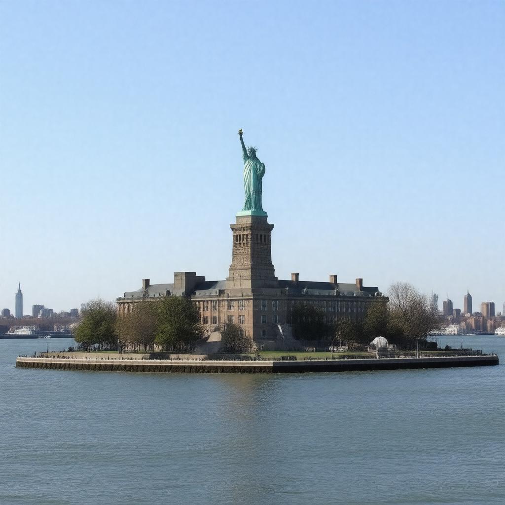 "Generate an image of Ellis Island, a historic island in New York Harbor, with its iconic immigration inspection station, now a museum and national monument, surrounded by water and with the Statue of Liberty in the background, in a realistic and nostalgic style."