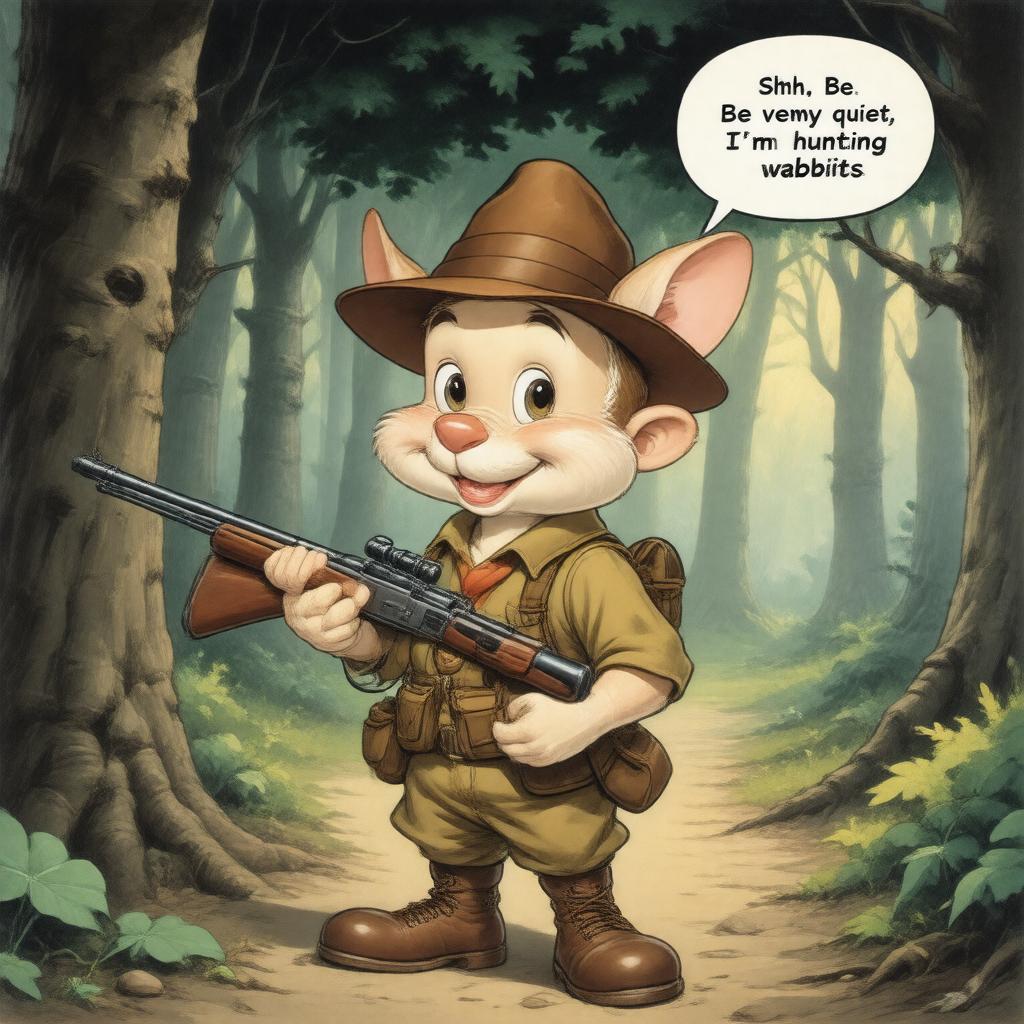 Generate an image of a cartoon character, specifically Elmer Fudd, a hunter from the Looney Tunes series, in a forest setting, wearing his signature hunting attire and holding a rifle, with a speech bubble saying "Shhh. Be vewy quiet, I'm hunting wabbits."