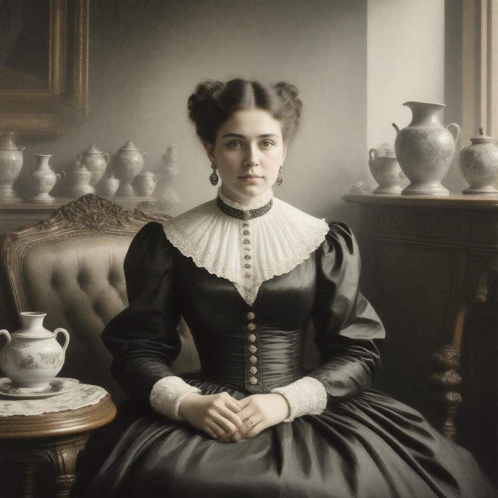 Generate a realistic portrait image of Emma Wedgwood, wife of Charles Darwin, in a Victorian-era style, sitting in a elegant interior with subtle hints of her family's pottery heritage, wearing attire typical of the British upper class during the mid-19th century, conveying a sense of intelligence, kindness, and gentle strength.