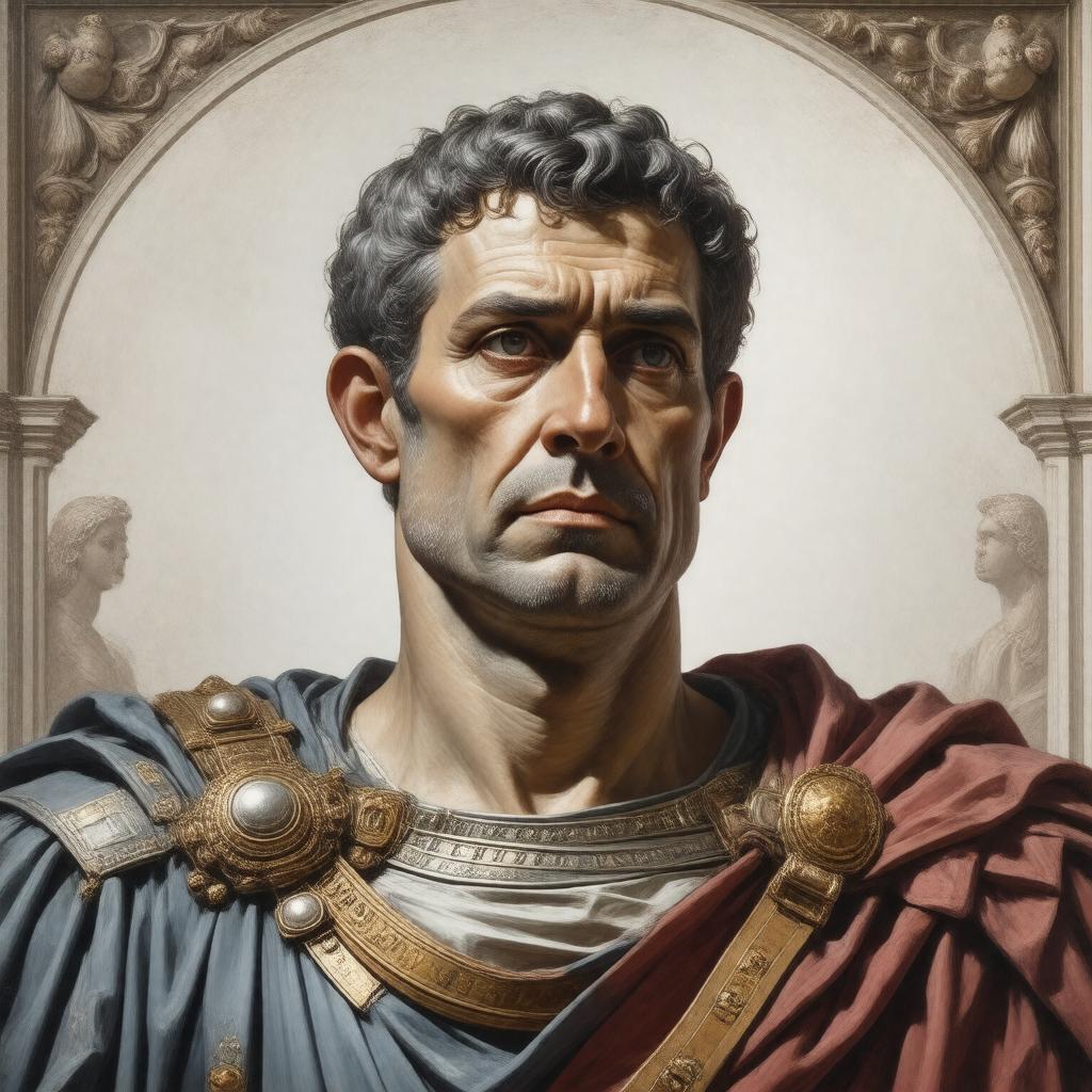 "Generate an image of Emperor Constantine I, also known as Constantine the Great, in a realistic and regal style, depicting him as a mature Roman emperor in his imperial attire, with a strong and authoritative presence, set against a backdrop that subtly suggests the grandeur of the Roman Empire or the symbols of his reign, such as the Labarum or the Chi-Rho symbol."
