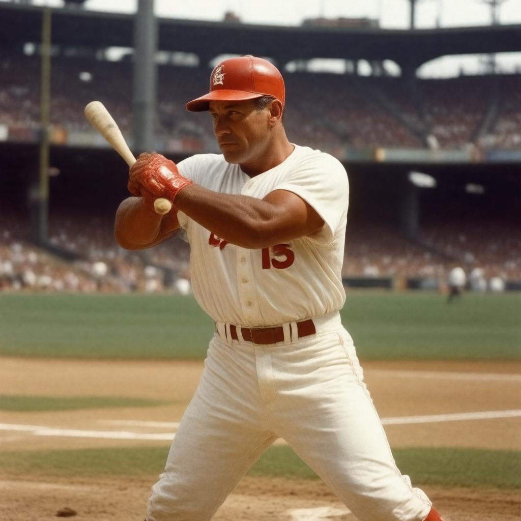 Generate an image of Enos Slaughter, a human, specifically a baseball player, in his St. Louis Cardinals uniform, swinging a bat, with a vintage baseball stadium in the background, in a realistic style reminiscent of the 1940s and 1950s, capturing his nickname "Country" and his impressive career statistics.