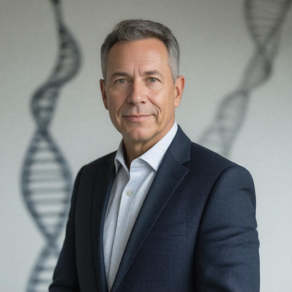 A realistic portrait of Eric Lander, a middle-aged man with a gentle expression, wearing a suit and standing in front of a subtle background that hints at his connection to science, such as a faint image of a DNA double helix or a laboratory setting. He should be depicted with a slight smile, conveying his achievements and contributions to the field of genomics and mathematics. The style should be formal and professional, reflecting his status as a renowned biologist, mathematician, and academic administrator.