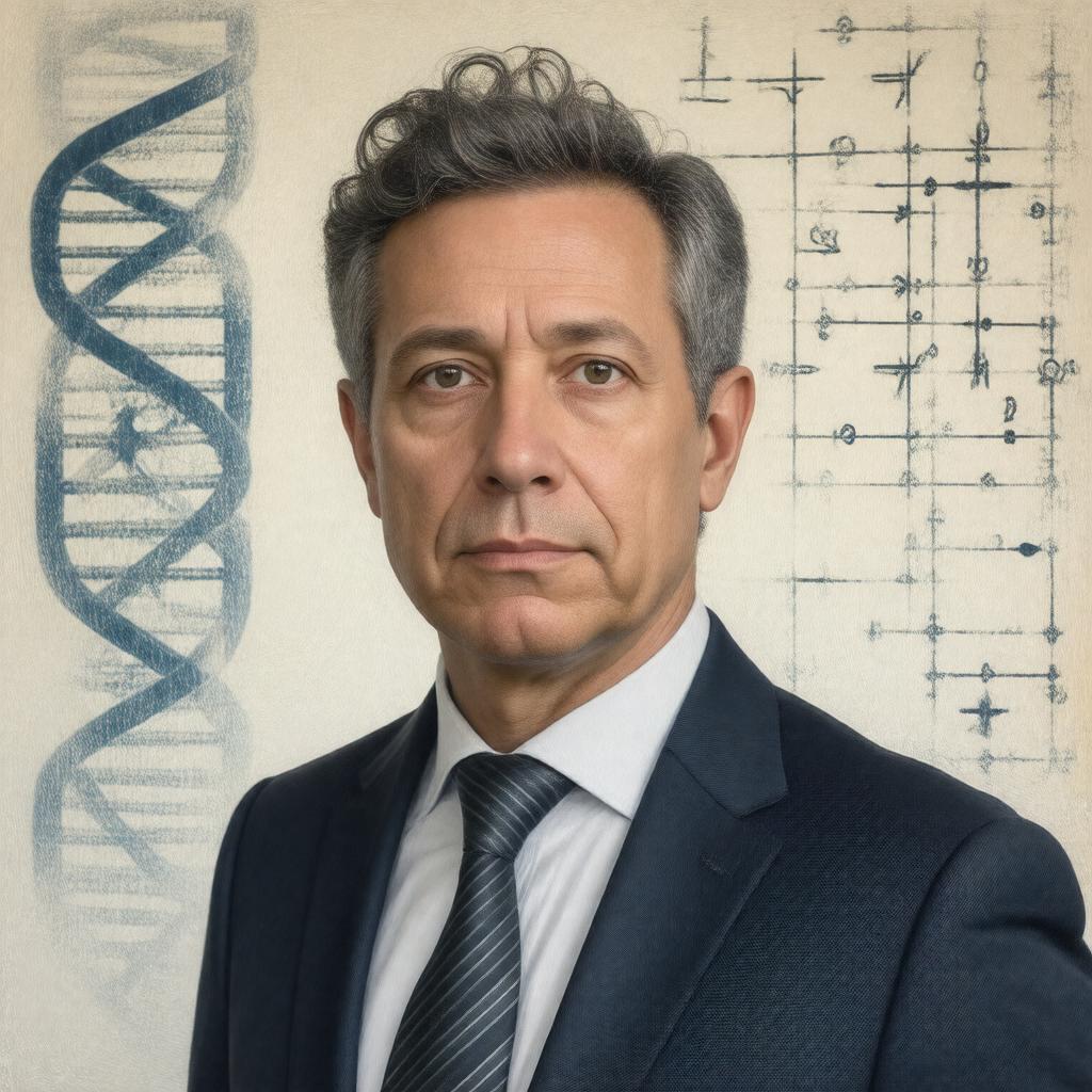 "Generate a realistic portrait of Eric Steven Lander, a middle-aged human male with a serious expression, wearing a suit and standing in front of a background that subtly represents his work in genomics and mathematics, such as a faint image of a DNA double helix or a mathematical equation; incorporate elements that reflect his Jewish heritage and his role as a prominent figure in science, such as a subtle Star of David or a book/scroll in the background; use a formal, professional style reminiscent of a photograph taken at a prestigious event or a official portrait."