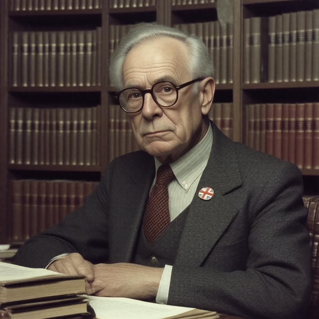 Create an image of a mature, bespectacled man in his later years, sitting in a library or study surrounded by books, with a thoughtful expression. He has a distinguished, intellectual appearance. Incorporate elements that reflect his Austrian and British heritage, such as a subtle Austrian-style pattern on his tie or a British flag pin on his lapel. Include some visual references to his notable works, such as "The Story of Art" or "Art and Illusion", perhaps on a nearby bookshelf or on his desk. The style should be realistic, with a muted color palette that evokes a sense of sophistication and learning. The man should be dressed in formal, slightly old-fashioned attire, such as a suit and tie, to reflect his profession as an art historian and writer.
