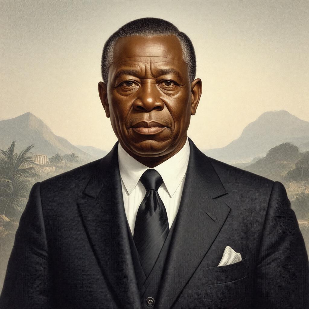 Generate an image of Errol Barrow, a prominent figure in Caribbean history, depicted as a dignified and influential leader, dressed in formal attire, possibly a suit and tie, with a subtle background that reflects his connection to Barbados, such as a faint image of the Barbadian landscape or national symbols; the style should be realistic and respectful, capturing his significance as a politician, lawyer, and national hero.