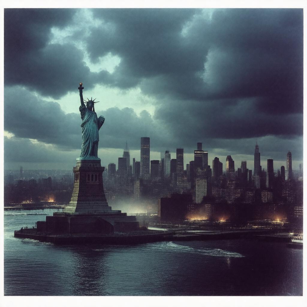 "Generate an image of a dystopian Manhattan Island, with the Statue of Liberty in the background, depicting a scene from the 1981 science fiction film 'Escape from New York', starring Kurt Russell as Snake Plissken, with a dark and gritty tone, reflecting the film's themes of chaos and rebellion."