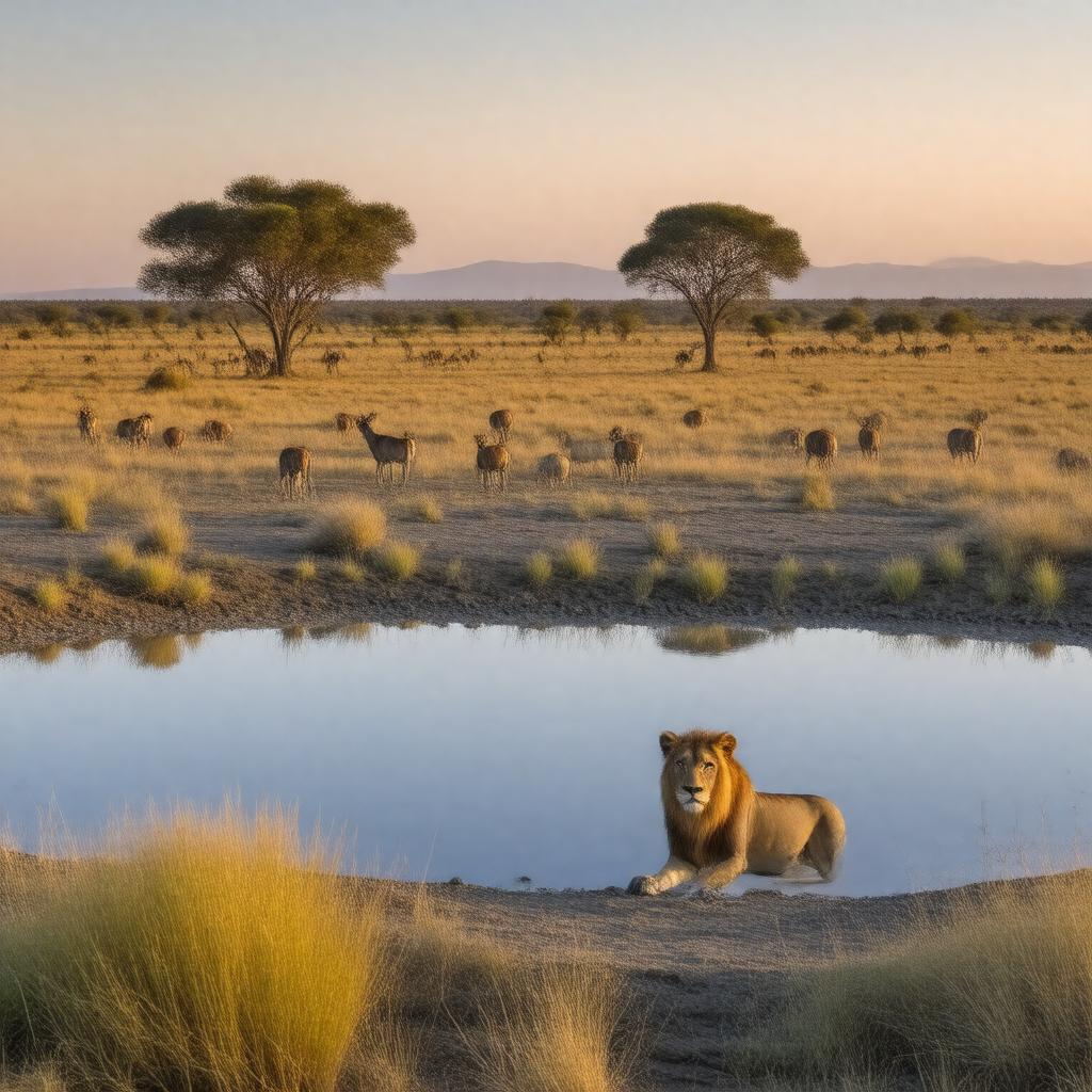 "Generate an image of a majestic savannah landscape at sunset, featuring a large salt pan in the foreground, surrounded by grasslands and acacia trees, with a pride of lions lazing in the shade, and a herd of springboks and wildebeests grazing in the distance, within the 22,270 km² Etosha National Park in Namibia, with a style that captures the serenity and beauty of this African nature reserve."