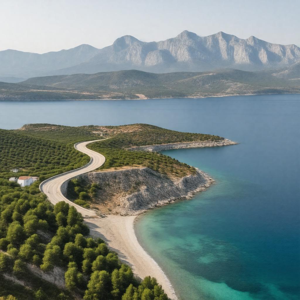 "Generate an image of a scenic view of Euboea, the second-largest Greek island, with its mountainous terrain, coastline, and beaches. In the foreground, depict the Chalcis Bridge connecting the island to the mainland, and in the background, show the Dirfi and Ochi mountain ranges. Include a glimpse of the Euripus Strait separating the island from the mainland. Style: a realistic landscape photograph with a warm, sunny lighting, highlighting the natural beauty of the island."