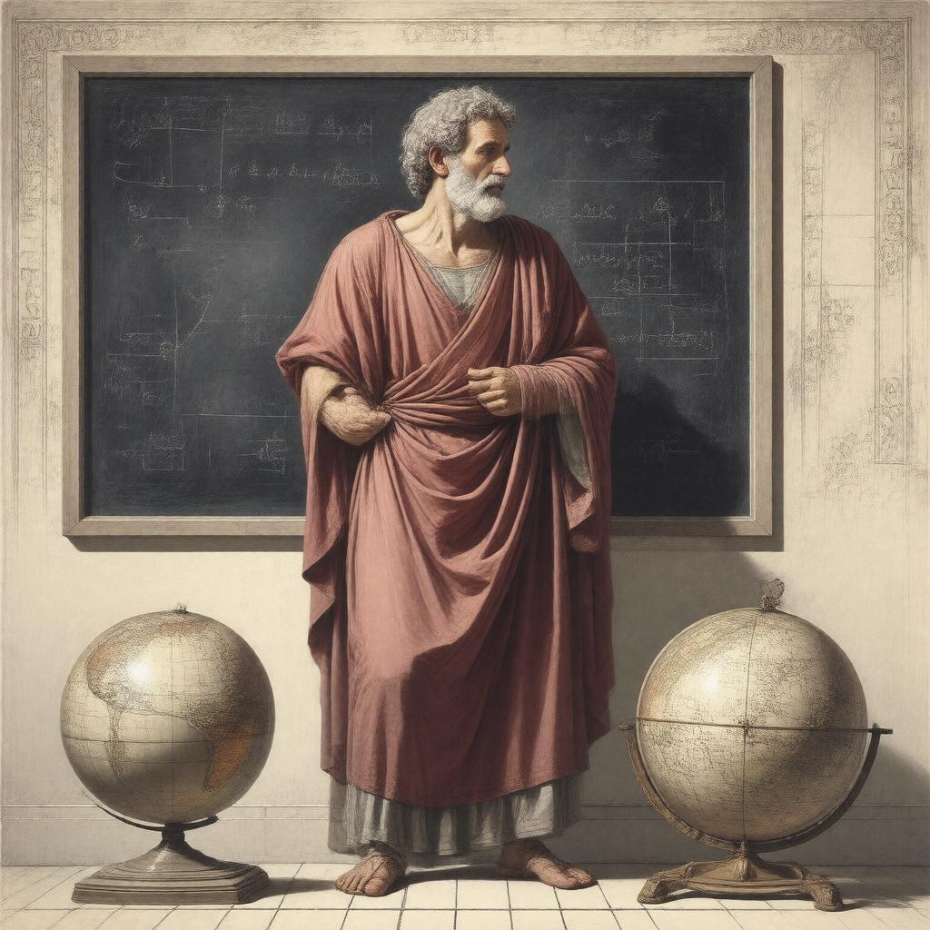 "Ancient Greek philosopher in contemplation, standing in front of a blackboard filled with mathematical equations and astronomical observations, wearing a traditional Greek himation, with a globe of the Earth and a quadrant for astronomical measurements nearby, in a style reminiscent of neoclassicism, Eudoxus of Cnidus, 408-355 BC, mathematician, astronomer, and philosopher, with a thoughtful expression, in a serene landscape of ancient Cnidus."