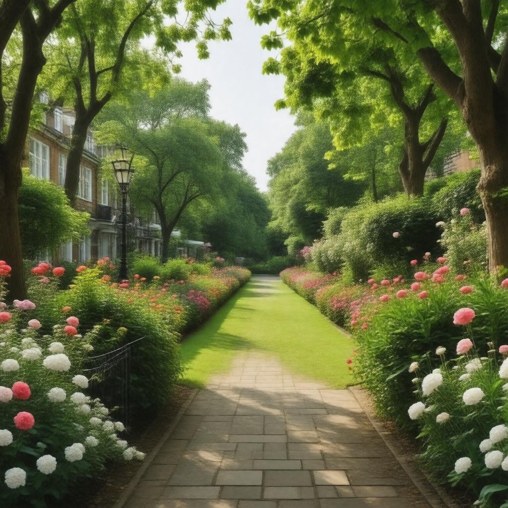 "Generate an image of a serene residential garden in Chelsea, London, with lush greenery and vibrant flowers, surrounded by elegant buildings, representing Evelyn Gardens, a picturesque residential area and garden in the Royal Borough of Kensington and Chelsea, known for being the residence of students from Imperial College London, London School of Economics, and Royal College of Art."